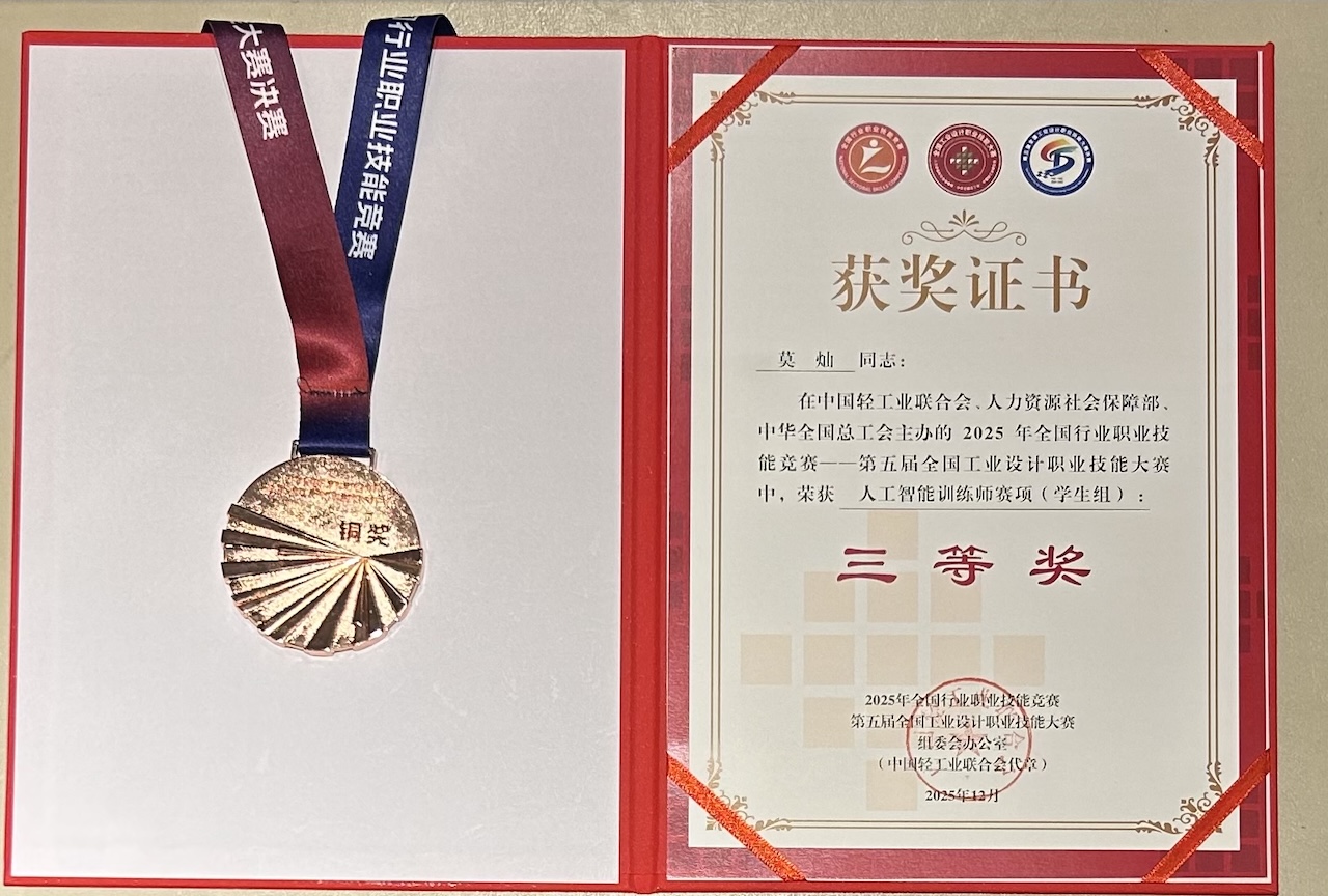 【本網(wǎng)消息】(智能工程學院 徐詩娟供稿)12月12日,由中國輕工業(yè)聯(lián)合會與人力資源社會保障部、中華全國總工會聯(lián)合舉辦第五屆全國工業(yè)設(shè)計職業(yè)技能大賽在浙江寧波順利舉行。四川長江職業(yè)學院智能工程學院24級AI+大數(shù)據(jù)開崗位班莫燦同學在本次比賽人工智能訓(xùn)練師賽項中,經(jīng)過激烈角逐,憑借扎實的專業(yè)技能和出色的現(xiàn)場發(fā)揮,最終榮獲全國三等獎,也是我校在該賽事人工智能訓(xùn)練師賽項中的突破,值得祝賀。