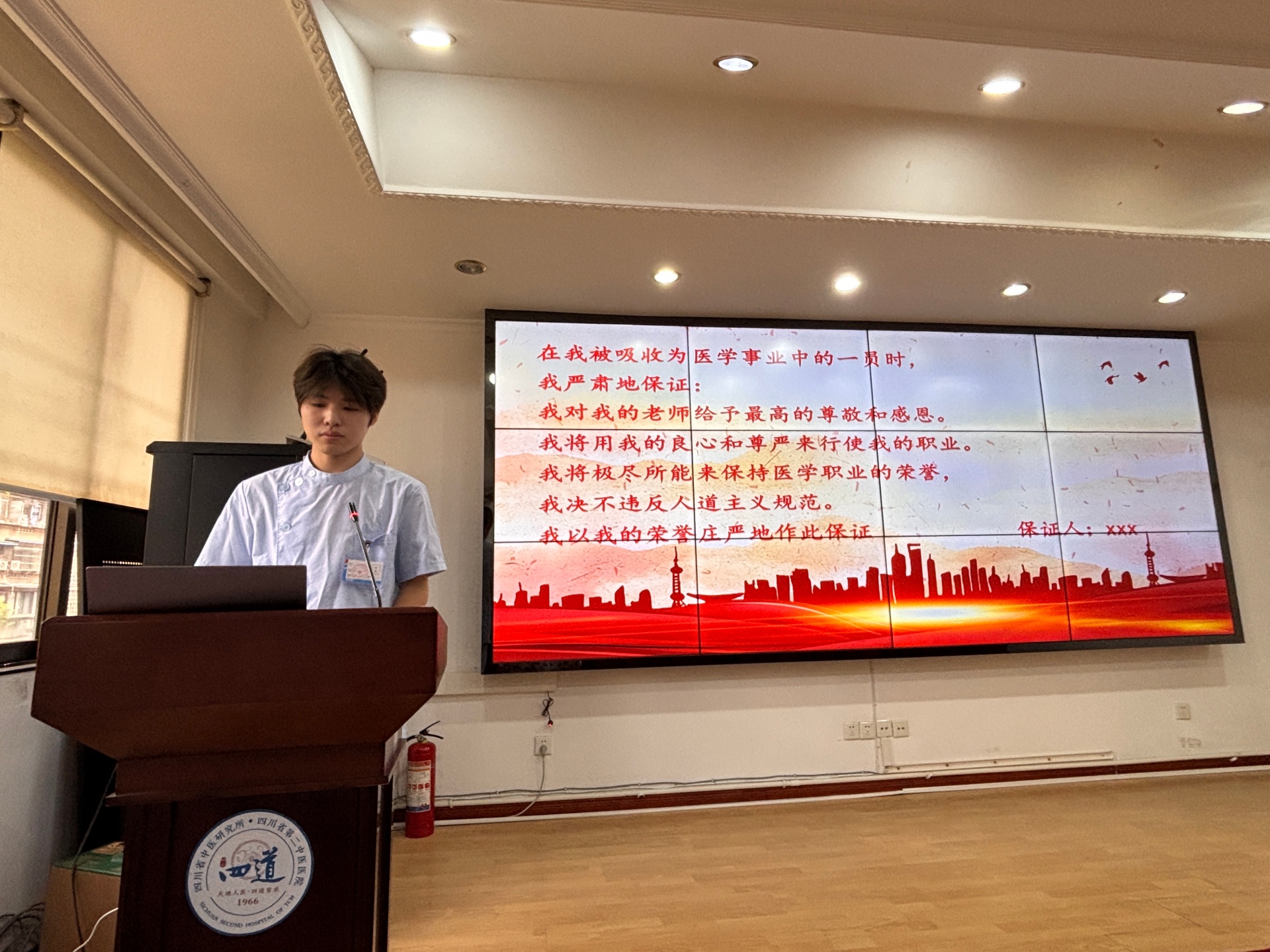 儀式中還舉行了莊嚴(yán)的教師集體宣誓、傳統(tǒng)拜師儀式和臨床導(dǎo)師聘書頒發(fā)環(huán)節(jié)。學(xué)生們依次向?qū)煶拾輲熖⑿邪輲煻Y,導(dǎo)師回贈(zèng)禮物并給予勉勵(lì),彰顯師道傳承與責(zé)任共擔(dān)。在2024級(jí)班長(zhǎng)的帶領(lǐng)下,全體學(xué)員鄭重宣誓,承諾恪守職業(yè)準(zhǔn)則、尊重患者、精進(jìn)不懈。