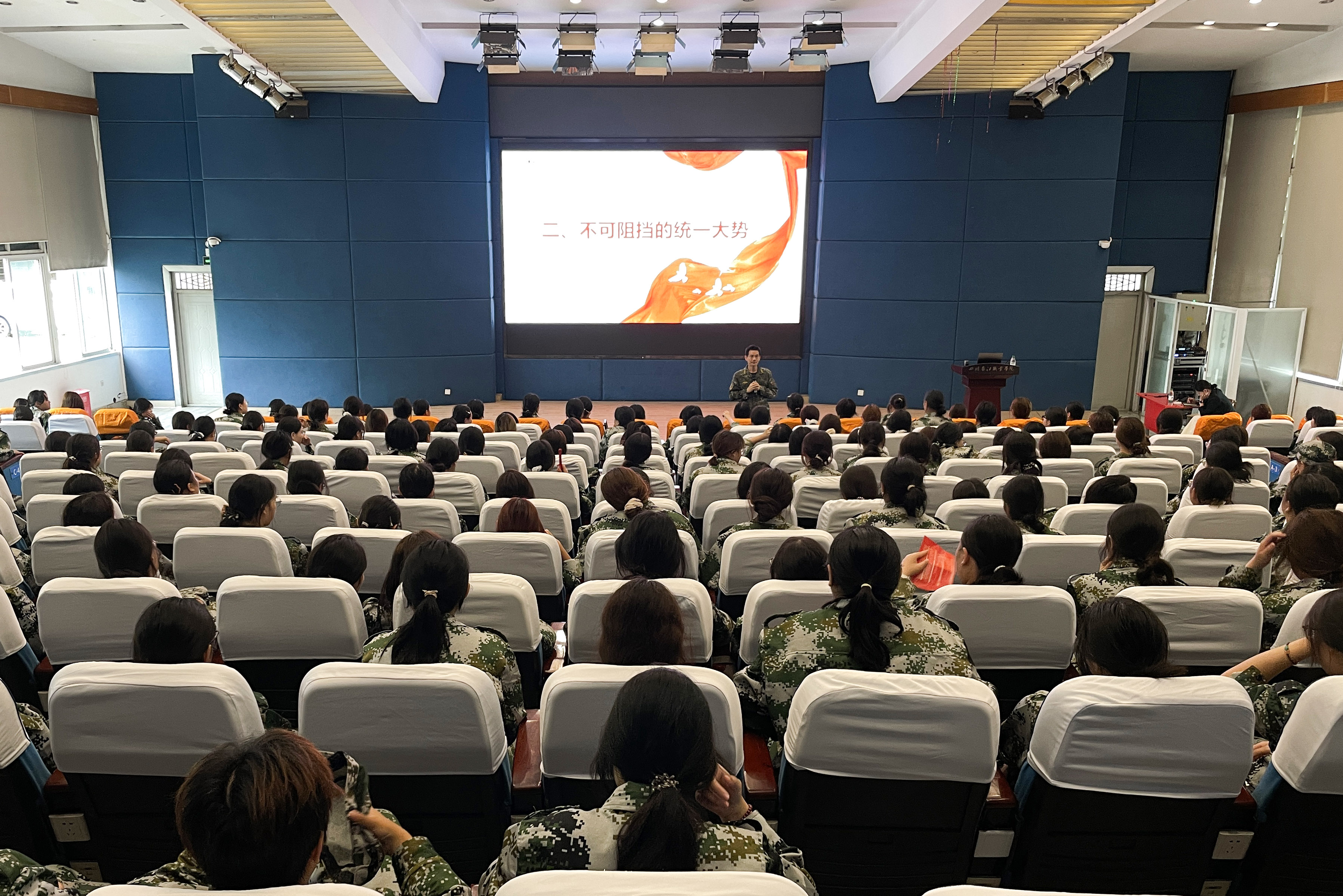 【本網(wǎng)消息】(教育與設(shè)計(jì)學(xué)院胡娟供稿)為進(jìn)一步落實(shí)新時(shí)代國(guó)防教育要求,增強(qiáng)大學(xué)生的國(guó)家安全意識(shí)與歷史使命感,9月6日至7日,我校開展為期兩天的軍事理論專題講座。來自全校各二級(jí)學(xué)院共計(jì)2600余名新生參加了此次講座。課程特邀四川省社會(huì)教育發(fā)展促進(jìn)會(huì)國(guó)防教育專業(yè)委員會(huì)智庫專家及多位軍旅背景深厚的專家教授,為新生帶來了一場(chǎng)思想深刻、內(nèi)容充實(shí)的國(guó)防教育盛宴。