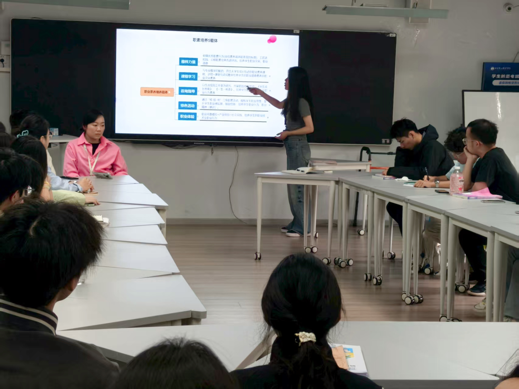 本次座談會(huì)聚焦“學(xué)校職業(yè)素養(yǎng)培養(yǎng)的五載體”這一主題。會(huì)議重點(diǎn)圍繞三個(gè)方面展開:一是系統(tǒng)介紹了職業(yè)素養(yǎng)課程建設(shè)和開展情況,并現(xiàn)場(chǎng)征集了同學(xué)們對(duì)課程的感受與建議;二是詳細(xì)說明了全校職業(yè)素養(yǎng)活動(dòng)的年度安排,鼓勵(lì)學(xué)生積極參與,在實(shí)踐中鍛煉職業(yè)能力;三是引導(dǎo)學(xué)生自主進(jìn)行職業(yè)發(fā)展規(guī)劃,強(qiáng)調(diào)知識(shí)積累與分享的重要性,提升自主學(xué)習(xí)能力。